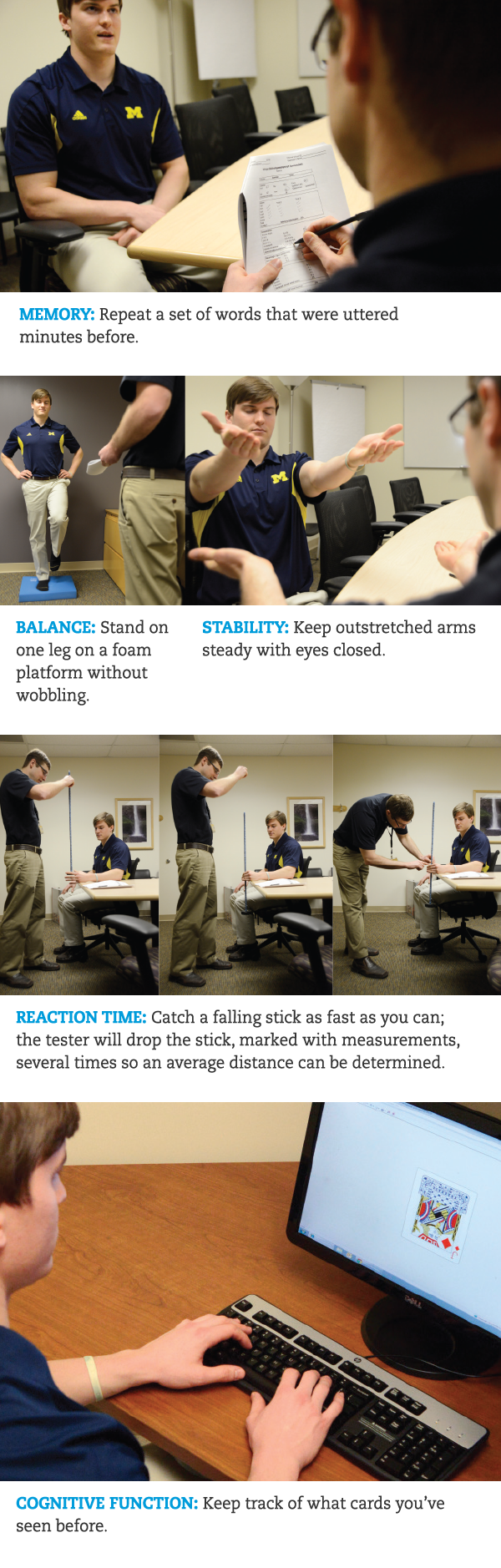 More than 100 football players at Michigan crammed into a hotel ballroom last summer to take baseline tests – computerized drills that assess cognitive function, checking balance by standing on one leg in several awkward positions on a foam pad, examining memory by asking players to recall sequences of words or numbers and analyzing their physical reaction time by asking them to catch a large hammer that is dropped in front of them as fast as they can.