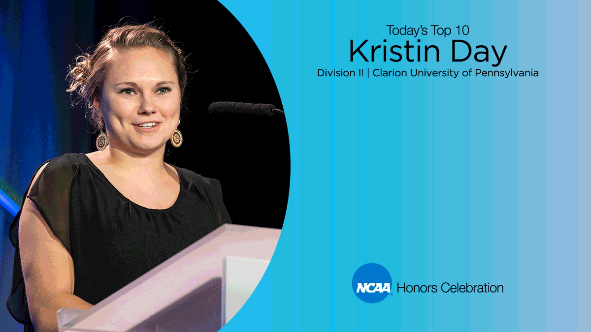 Kristin Day, the 2015 NCAA Woman of the Year, won three individual national championships in diving events and set an NCAA diving record in points on the 3-meter while competing at Clarion University of Pennsylvania. Her outstanding diving performances earned her eight All-America honors from the College Swimming Coaches Association of America. In 2014, the CSCAA named her the Division II Diver of the Year. Day also competed internationally in the trampoline but elected to focus more on her studies. In 2014, Day won the Elite 89 Award, presented to the college athlete competing at an NCAA championship with the highest GPA. She also earned Capital One Division II Academic All-America of the Year honors in back-to-back years. The two-year captain served one year on her campus student-athlete advisory committee and as chief financial officer for her family's Ride for Research initiative, which has raised more than $60,000 for cancer research. She is now attending medical school at Lake Erie College of Osteopathic Medicine.