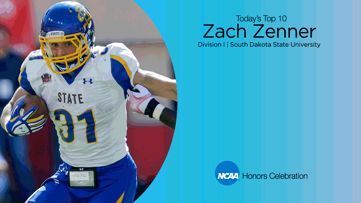 South Dakota State University football star Zach Zenner graduated with a degree in biology and seven records in football. He is the only player in Division I history to rush for 2,000 yards in three consecutive seasons. He also holds Missouri Valley Football Conference records for career touchdowns (69) and career rushing touchdowns (61). He is the only player in school history with three consecutive 1,500-yard seasons, and holds the school records for carries (351), as well as the single-game rushing record (295 yards). In the NFL, Zenner is a running back for the Detroit Lions. The three-time AFCA All-American also earned Capital One Academic All-America honors in 2013 and 2014, and in 2014 was named the Capital One Academic All-America Team Member of the Year. He received the Joseph F. Nelson Undergraduate Research Award in 2013 for colon cancer research, and was later awarded an NCAA Postgraduate Scholarship in 2014. He capped his senior season as a member of the AFCA Good Works team, in recognition of his work in community service as well as academics and athletics.