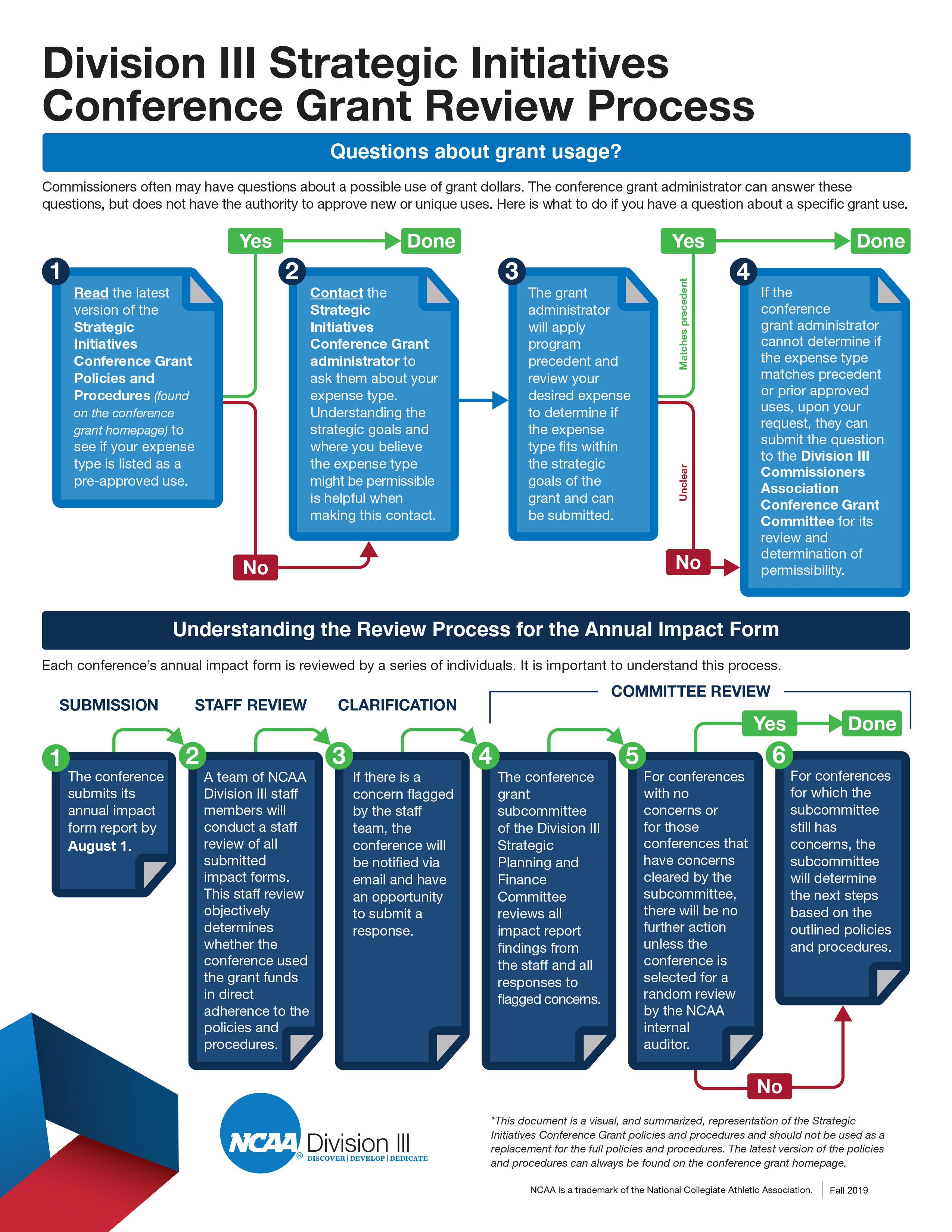 Each year, NCAA Division III allocates approximately $4.2 million directly to conferences and Association of Division III Independents to administer educational programs and services that best meet local needs in support of the Division III strategic plan.  The grant is intended to encourage collaboration and involvement of all Division III constituent groups (presidents, athletics direct reports, athletics directors, senior woman administrators, faculty athletics representatives, sports information directors, and student-athletes) in planning, decision making and accountability of programming at the local level to achieve the goals established in the strategic plan and the grant program.  Consistent with the legislated leadership role of presidents and chancellors within conference governance, presidential oversight and accountability with the process and budget allocations is paramount.