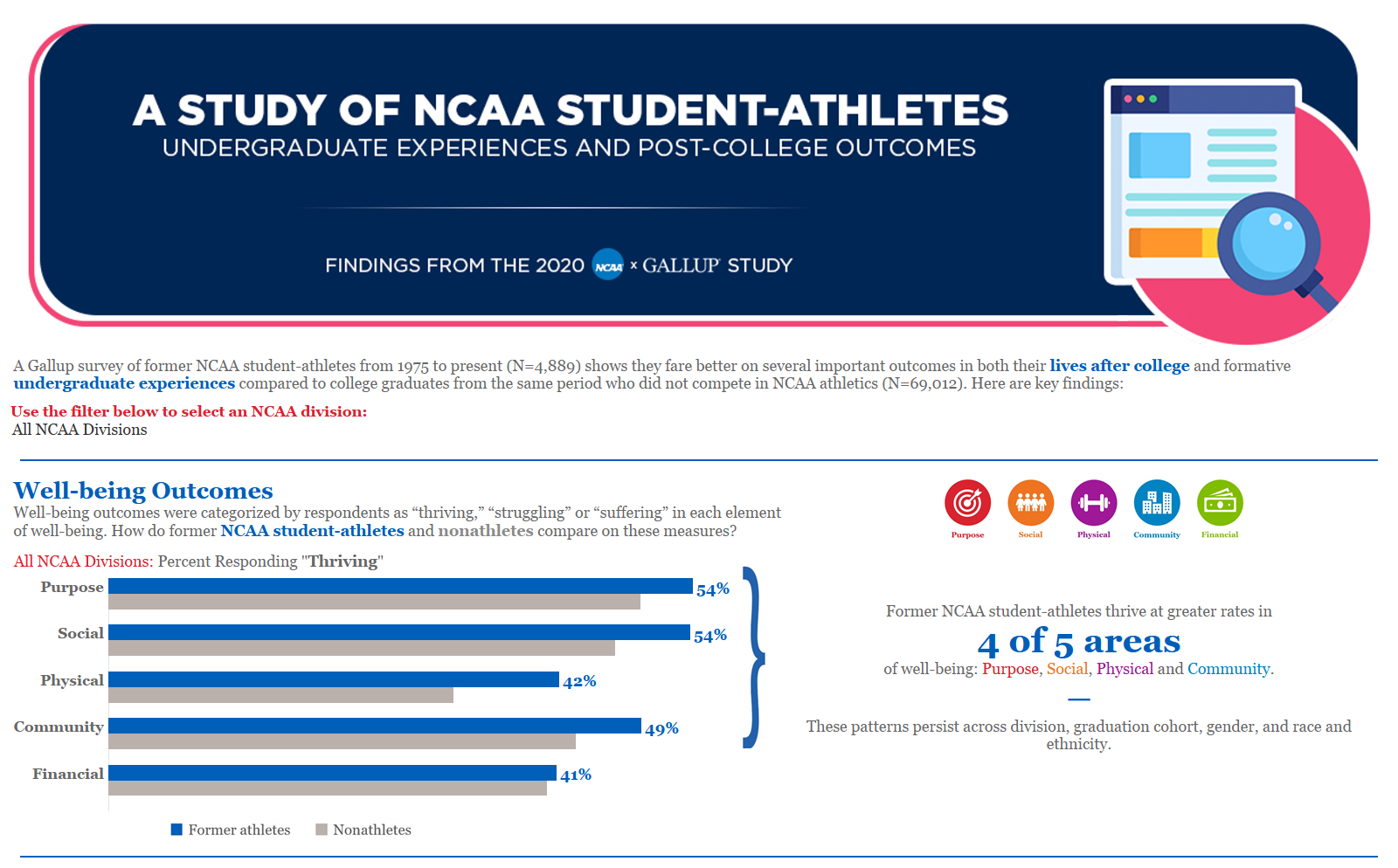 Gallup’s 2020 study on the college experiences and life outcomes of college graduates who competed in NCAA athletics in Divisions I, II or III, found NCAA student-athletes engaged in important undergraduate experiences at higher rates than their nonathlete peers. Former student-athletes were also more likely to be thriving in many post-college domains.